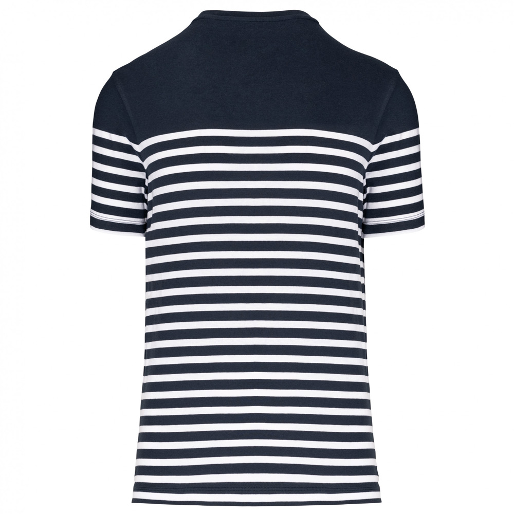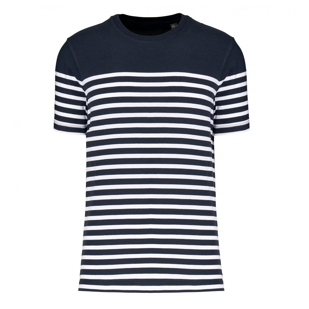 100% coton. Ce t-shirt est conçu à partir de 100% de coton peigné biologique. Le certificat GOTS est délivré par Ecocert Greenlife. Coupe droite. Lavage aux enzymes. Encolure ronde avec bord-côte 1×1. Rayures tricotées. Bande de propreté au col. Finition double aiguille bas de manches et bas de vêtement. Pas d’étiquette de marque pour faciliter la personnalisation.